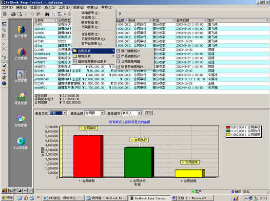 可對客戶(雇員)合同,根據(jù)合同階段、月份、合同金額、合同應(yīng)收應(yīng)付款、采購成本、客戶、銷售人員等條件進(jìn)行查詢和統(tǒng)計, 查詢統(tǒng)計結(jié)果以詳細(xì)列表及圖示進(jìn)行顯示。