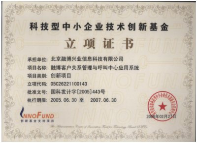 "融博客戶(hù)關(guān)系管理與呼叫中心應(yīng)用系統(tǒng)"喜獲國(guó)家里科技部2005年中小企業(yè)創(chuàng)新基金的立項(xiàng),以及中關(guān)村科技園區(qū)的創(chuàng)新基金!融博興業(yè)本次立項(xiàng)的產(chǎn)品是2005年北京地區(qū),乃至全國(guó)唯一獲得創(chuàng)新基金支持的CRM與呼叫中心應(yīng)用軟件項(xiàng)目。