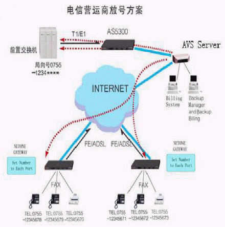 電信運(yùn)營(yíng)商放號(hào)方案采用寬帶數(shù)據(jù)網(wǎng)絡(luò)接入到運(yùn)營(yíng)商,IP電話(huà)數(shù)據(jù)流通過(guò)寬帶數(shù)據(jù)網(wǎng)絡(luò)接入運(yùn)營(yíng)商的局端網(wǎng)關(guān)設(shè)備,或者直接進(jìn)入IP電話(huà)網(wǎng)絡(luò)。與傳統(tǒng)的電話(huà)相比,電信運(yùn)營(yíng)商放號(hào)方案不需要太多的額外投資購(gòu)買(mǎi)硬件設(shè)備;只需在用戶(hù)端安裝NETONE語(yǔ)音網(wǎng)關(guān)或IP電話(huà)機(jī),話(huà)吧、網(wǎng)吧、企業(yè)網(wǎng)用戶(hù)、校園網(wǎng)用戶(hù)及個(gè)人用戶(hù)就可以在現(xiàn)有的網(wǎng)絡(luò)基礎(chǔ)上實(shí)現(xiàn)IP電話(huà)放號(hào)服務(wù)。