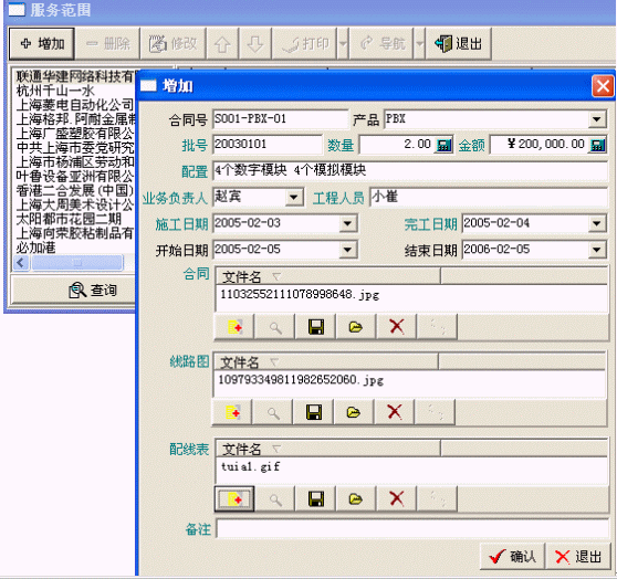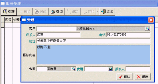 主要登記產(chǎn)品信息、客戶信息、服務(wù)合同、售后服務(wù)卡,接受客戶的投訴或請求,進(jìn)行派工和派工的跟蹤。