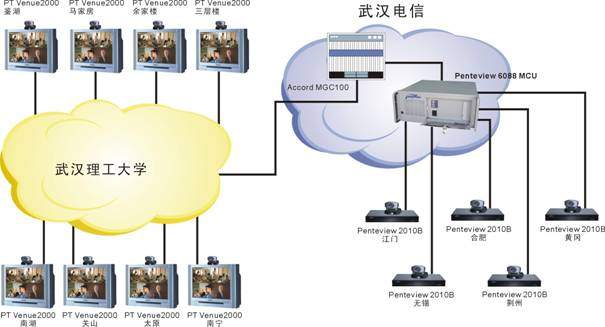 武漢理工大學(xué)的遠程教學(xué)系統(tǒng)由于分3期建設(shè),網(wǎng)絡(luò)條件較為復(fù)雜。一期主要以PT的Venue2000終端+Accord MGC100 MCU為主,是一個H323系統(tǒng);二、三期采用中太多媒體的Penteview2010終端+Penteview6088MCU,是一個H320系統(tǒng),兩套系統(tǒng)通過網(wǎng)關(guān)無縫結(jié)合到一起工作,用戶根本感覺不到不同。各教室均同時采用了中太多媒體的遠程教學(xué)支撐系統(tǒng),通過對Penteview會議電視系統(tǒng)的擴充,實現(xiàn)了以下功能,使教學(xué)應(yīng)用更加方便: