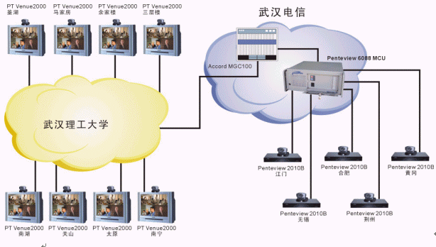 武漢理工大學(xué)的遠程教學(xué)系統(tǒng)由于分3期建設(shè),網(wǎng)絡(luò)條件較為復(fù)雜。一期主要以PT的Venue2000終端+Accord MGC100 MCU為主,是一個H323系統(tǒng);二、三期采用中太多媒體的Penteview2010終端+Penteview6088MCU,是一個H320系統(tǒng),兩套系統(tǒng)通過網(wǎng)關(guān)無縫結(jié)合到一起工作,用戶根本感覺不到不同。各教室均同時采用了中太多媒體的遠程教學(xué)支撐系統(tǒng),通過對Penteview會議電視系統(tǒng)的擴充,實現(xiàn)了以下功能,使教學(xué)應(yīng)用更加方便: