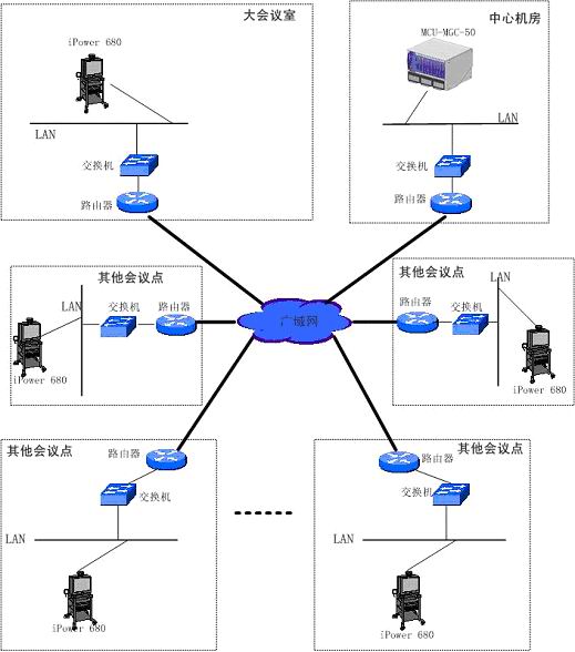 用戶將組建以多點控制單元MCU為中心,采用H.323 IP連接方式的H.323標準會議電視網(wǎng),端口速率為768kbps,多點控制單元要求的容量是可達到48個節(jié)點的同時接入。