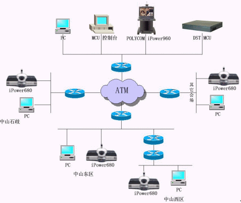 中山公安項(xiàng)目使用一臺(tái)DST H.323 MCS 3048/DFG的MCU、25套IPOWER600 SBRI終端和一套IPOWER900終端,目前終端使用4.01.408版本,通過(guò)的是IP OVER ATM網(wǎng)絡(luò),到每個(gè)會(huì)場(chǎng)的帶寬足夠---至少10M,會(huì)議召開速率為768Kbps。市局會(huì)議中心采用IPOWER900,其它25個(gè)分局會(huì)場(chǎng)都使用IPOWER600。