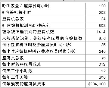 表1和表2表明在一個(gè)呼叫中心中精確的應(yīng)答機(jī)檢測(cè)(AMD)給企業(yè)所帶來的價(jià)值,兩表之間關(guān)于呼叫中心運(yùn)營(yíng)的費(fèi)用每年相差$175,500。那么不同的AMD精確度意味著什么?在上例中,精確度每增加1%意味著每年會(huì)減少約$5,850的損失。