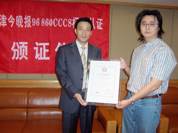 2004年9月9日,天津今晚報公眾服務(wù)中心通過了《全國呼叫中心運營績效標(biāo)準(zhǔn)》(CCCS-OP-2003)認(rèn)證,并獲得由中國信息化推進聯(lián)盟客戶關(guān)系管理專業(yè)委員會頒發(fā)的認(rèn)證證書(四星級客戶服務(wù)中心),成為國內(nèi)傳媒業(yè)首家通過此認(rèn)證的呼叫中心。