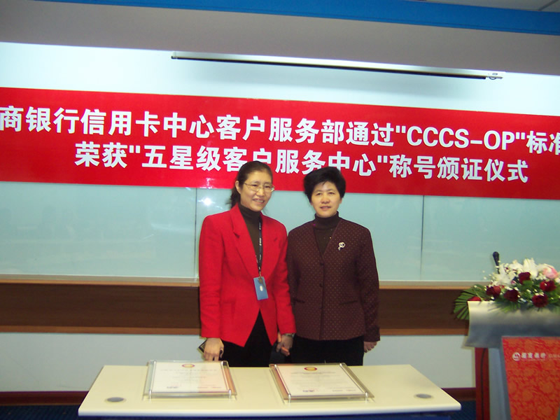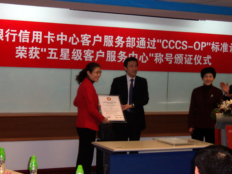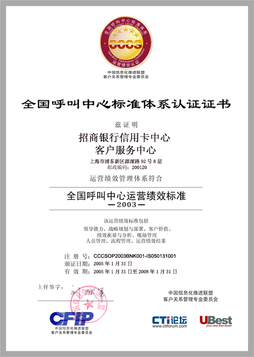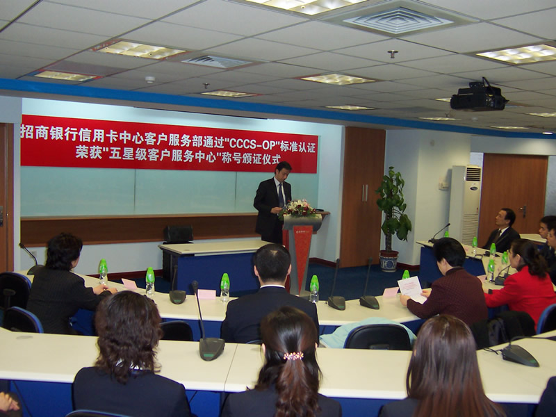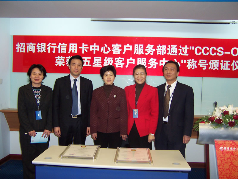 經(jīng)過長達8個月時間的準備和嚴格的認證審核,由中國信息化推進聯(lián)盟客戶關(guān)系管理專業(yè)委員會常務副主任郭晨東先生親自掛帥組成的項目評審專家小組從領(lǐng)導能力、戰(zhàn)略規(guī)劃與部署、客戶價值、績效衡量與分析、現(xiàn)場管理、人員管理、流程管理、運營績效結(jié)果等八個范疇對招商銀行信用卡中心客戶服務部進行了全面而嚴格的審核,涉及五大類上百項詳細的運營績效指標,歷經(jīng)初審評估、現(xiàn)場初審、初審評估報告提交與確認、標準試運行、績效全面提升、最終評審等階段,最終審核確認招商銀行信用卡中心客戶服務完全符合并部分超越《全國呼叫中心運營績效標準》(CCCS-OP-2003)的各項標準指標和要求,于2005年1月31日正式批準招商銀行信用卡中心通過該標準的五星級認證,授予“五星級客戶服務中心”稱號。