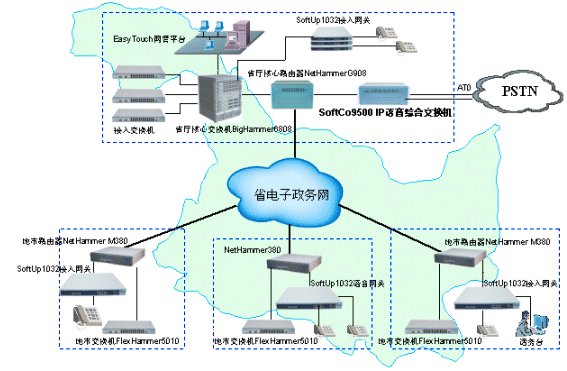 ×省×廳和與各地市局之間原來采用PSTN網(wǎng)絡(luò)實(shí)現(xiàn)語音通信,省局和市局,市局和市局之間每個(gè)月的通訊費(fèi)用高達(dá)數(shù)萬元,無形之中長(zhǎng)途電話費(fèi)用已經(jīng)成為日常行政支出中很大的一部分。該廳已經(jīng)采用港灣公司NetHammer
