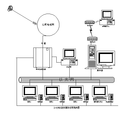 | ZQ-315電話投訴服務(wù)系統(tǒng)由如下各部分組成: 4呼叫排隊(duì)交換系統(tǒng) 4座席臺 4數(shù)據(jù)庫服務(wù)器 4系統(tǒng)維護(hù)管理臺 4同步數(shù)字錄音系統(tǒng) 4遠(yuǎn)程通訊模塊 4遠(yuǎn)程維護(hù)終端 各部分通過集線器和五類雙絞線組成快速以太網(wǎng);各節(jié)點(diǎn)之間采用TCPAP協(xié)議,以 Socket方式進(jìn)行通訊。其組成結(jié)構(gòu)如下圖所示。 ![]() 1.呼叫排隊(duì)交換系統(tǒng) 4與公用電話網(wǎng)相連,將來話分配到座席臺或遇忙排隊(duì) 4自動應(yīng)答來話,完成自動受理投訴與自動查詢服務(wù) 4進(jìn)行呼叫轉(zhuǎn)移 2.座席臺 4人工應(yīng)答來話 4顯示主叫號碼、戶主與地址等信息(根據(jù)需要) 4計(jì)算機(jī)輔助投訴受理 4計(jì)算機(jī)輔助業(yè)務(wù)咨詢(法律。個案等) 3.?dāng)?shù)據(jù)庫服務(wù)器 4運(yùn)行網(wǎng)絡(luò)操作系統(tǒng) 4運(yùn)行數(shù)據(jù)庫系統(tǒng) 4提供各種數(shù)據(jù)服務(wù) 4對網(wǎng)絡(luò)安全性進(jìn)行檢查控制 4.系統(tǒng)維護(hù)管理臺 4對數(shù)據(jù)庫進(jìn)行維護(hù)管理 4查詢各種業(yè)務(wù)數(shù)據(jù),生成統(tǒng)計(jì)報(bào)表。 5.同步數(shù)字錄音系統(tǒng) 4將模擬話音轉(zhuǎn)換成數(shù)字信號,并壓縮存儲。多路錄音,互不干擾 4支持多種語音數(shù)據(jù)壓縮格式(如PCMchDPCM、WAV等) 4播放放音 6.遠(yuǎn)程通訊模塊 4與上級或遠(yuǎn)程系統(tǒng)進(jìn)行通訊。 7.遠(yuǎn)程維護(hù)終端 4遠(yuǎn)程撥號登陸系統(tǒng),對系統(tǒng)進(jìn)行全面維護(hù) |