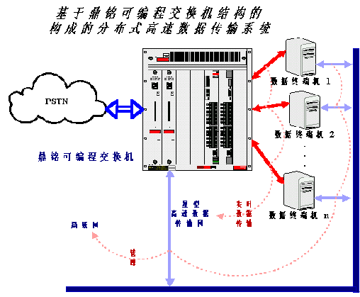 鼎銘高速數(shù)據(jù)傳輸板置于其可編程交換機內(nèi),外部可以和多臺PC或工控機相連,因為可編程交換機可以級聯(lián),所以可以和外部連接的PC或工控機理論上沒有特別限制。這樣可編程交換機的內(nèi)部I/O總線(類比于PC機的PCI或ISA總線)就不再傳輸實時數(shù)據(jù)(如語音數(shù)據(jù)),而只負責(zé)非實時性的管理和信令數(shù)據(jù),語音或其它實時數(shù)據(jù)從外部PC直接傳入可編程交換機的高速數(shù)據(jù)傳輸板,然后通過交換直接進入外部公共電信網(wǎng)(PSTN)。