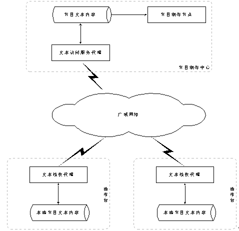 單一的節(jié)目制作中心一般放置在省中心。在節(jié)目制作中心,節(jié)目數(shù)據(jù)以數(shù)據(jù)庫(kù)或者文本文件的方式存放于節(jié)目數(shù)據(jù)倉(cāng)庫(kù)中。在節(jié)目制作中心運(yùn)行文本訪問(wèn)服務(wù)代理,接受各地市臺(tái)的數(shù)據(jù)請(qǐng)求并發(fā)送相應(yīng)的數(shù)據(jù)。各個(gè)地市臺(tái)通過(guò)文本請(qǐng)求、接收代理向中心請(qǐng)求或者接收文本數(shù)據(jù),存放于本地?cái)?shù)據(jù)倉(cāng)庫(kù),等待語(yǔ)音合成服務(wù)器合成成語(yǔ)音文件,地市臺(tái)使用合成后的語(yǔ)音文件迅速開通相應(yīng)的節(jié)目。