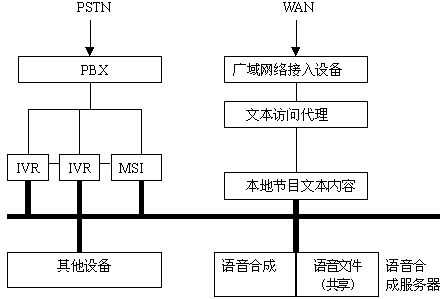 離線合成可以與省級(jí)甚至全國(guó)聲訊網(wǎng)絡(luò)結(jié)合,開發(fā)出靈活的聯(lián)網(wǎng)業(yè)務(wù)。即文本訪問(wèn)代理從廣域網(wǎng)上取得節(jié)目文本數(shù)據(jù)存放于本地的文本數(shù)據(jù)共享目錄,語(yǔ)音合成服務(wù)器通過(guò)訪問(wèn)該目錄獲取節(jié)目文本合成為語(yǔ)音文件存放與服務(wù)器的語(yǔ)音文件共享目錄中。局域網(wǎng)內(nèi)其他設(shè)備(IVR、MSI等等)訪問(wèn)語(yǔ)音文件共享目錄,向用戶播放最新生成的語(yǔ)音信息。