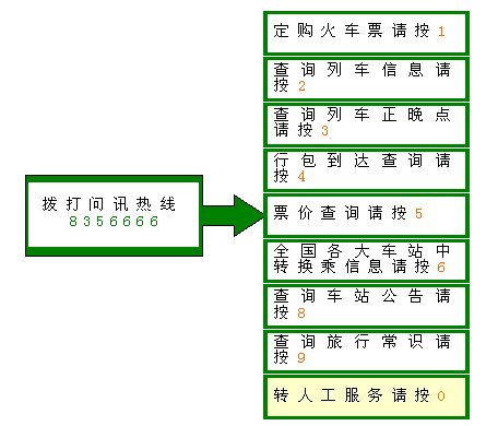 進(jìn)入系統(tǒng)后可以進(jìn)行定購火車票、查詢列車信息、查詢列車正晚點(diǎn)、行包到達(dá)查詢等操作。所有供查詢信息都由系統(tǒng)實(shí)時(shí)從數(shù)據(jù)庫中調(diào)用,由訊飛語音合成系統(tǒng)轉(zhuǎn)換成語音播放,不僅保證了信息的實(shí)時(shí)性,同時(shí)業(yè)務(wù)更加靈活,語音效果更好,系統(tǒng)的管理和維護(hù)也比以前便捷多了。