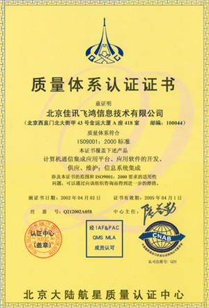 經(jīng)過近半年時間的建立和保持質(zhì)量體系運行,佳訊飛鴻于在2002年3月順利的通過為期三天的嚴(yán)格審核,并重點對佳訊公司核心技術(shù)的CTI平臺進(jìn)行審核。2002年4月2日通過了ISO國際組織的新體系標(biāo)準(zhǔn)ISO9001:2000的體系認(rèn)證,取得了通過該標(biāo)準(zhǔn)的認(rèn)證證書。佳訊飛鴻公司也成為國內(nèi)第一家對CTI平臺進(jìn)行審核并通過認(rèn)證的公司。其完成標(biāo)志著公司從成立之時起即嚴(yán)格遵循國際企業(yè)標(biāo)準(zhǔn)及現(xiàn)代企業(yè)管理模式,以軟件產(chǎn)品質(zhì)量管理體系為載體,以客戶需求為導(dǎo)向。全面提高產(chǎn)品、服務(wù)質(zhì)量,順應(yīng)不斷變化的技術(shù)發(fā)展方向和市場變化,在質(zhì)量、技術(shù)、成本和交期等方面全力滿足客戶需求,為客戶提供最佳性價比的產(chǎn)品和服務(wù)。