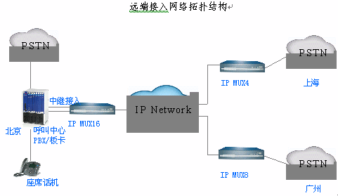 遠(yuǎn)端接入:根據(jù)實(shí)際遠(yuǎn)端中繼數(shù)量,選擇IP MUX4/8/16網(wǎng)關(guān),通過(guò)環(huán)路中繼接口連接本地的電信網(wǎng);