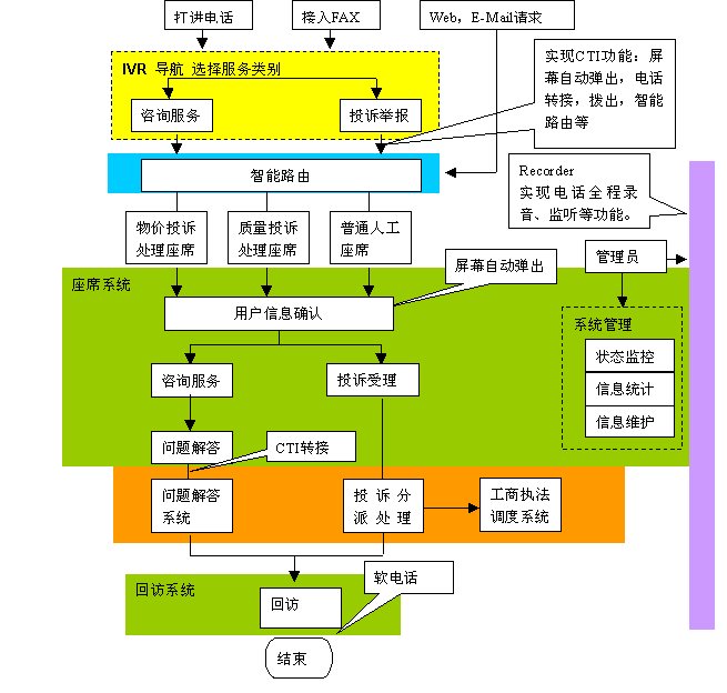 黎明網(wǎng)絡(luò)深入研究世界上最新的CTI技術(shù)的發(fā)展和應(yīng)用,自主研發(fā)推出的12315消費(fèi)者投訴受理系統(tǒng)采用當(dāng)前主流的一體化的呼叫中心模式。一體化的呼叫中心模式具有投資少、易于實(shí)施、維護(hù)工作量較小、維護(hù)成本低的優(yōu)點(diǎn)。該系統(tǒng)建立在內(nèi)部以太網(wǎng)基礎(chǔ)上,不同網(wǎng)絡(luò)(PSTN網(wǎng)、IP網(wǎng)、GSM/GPRS/CDMA網(wǎng))的消費(fèi)者可以通過(guò)多種方式(電話、傳真、E-mail、短消息等)接入12315系統(tǒng),利用系統(tǒng)提供的服務(wù)進(jìn)行投訴舉報(bào)或咨詢。