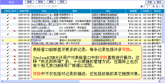 上圖"機會管理"表格窗口進一步對人本化的管理方法進行了舉例。在這里,您可直接對瀏覽到的字段進行交互(是否能夠新建、修改、刪除,受管理授權(quán)或默認授權(quán)約束),而不必一定要轉(zhuǎn)到另外的窗口才可操作字段。該方法在SynleadCRM中處處存在,它不僅僅為了提高工作效率,更讓企業(yè)在推行CRM管理變革時襯托出靈活性,而不是帶來了僵化。