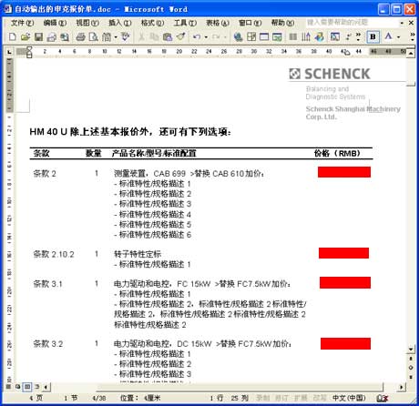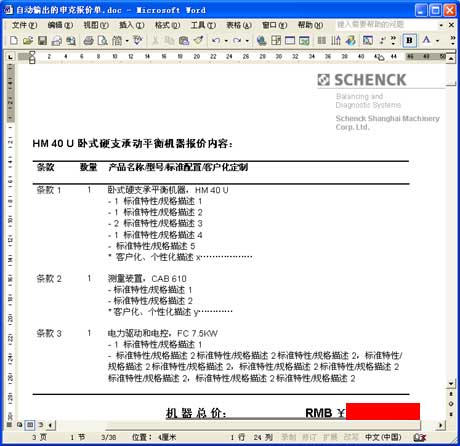 以上海申克的報(bào)價(jià)單為例。與其說它是一份報(bào)價(jià)單,不如說它是一套幾十頁的客戶化復(fù)雜方案書,它由各方面數(shù)據(jù)和文檔自動(dòng)合并、輸出為一份Word文件: