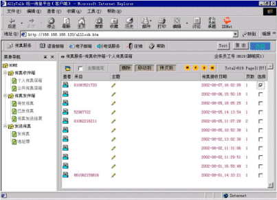 3、系統(tǒng)可以將外部的語(yǔ)音留言、傳真、EMAIL統(tǒng)一提交企業(yè)內(nèi)部的INTRANET服務(wù)器處理,使得職員在同一界面下完成多種任務(wù)。