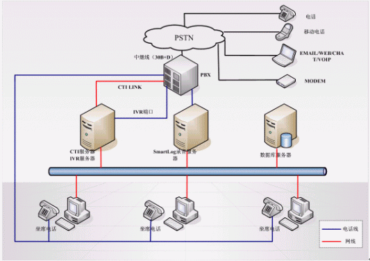 呼叫中心前端通信平臺,主要由SIEMENS HiPath系列交換機,計算機電話集成服務器(UltraCTI),交互式語音應答服務器(ctsIVR),在線錄音監(jiān)聽服務器(SmartLog),數(shù)據(jù)庫服務器,MCI服務器以及傳真服務器幾個部分組成。中繼線多采用30B+D或2B+D接入。