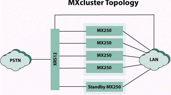 為支持冗余配置蘇迪思科技公司同時(shí)推出新產(chǎn)品XRS12物理連接轉(zhuǎn)換開關(guān)。XRS12可被安裝在19英吋的機(jī)架上,并將占用機(jī)架中的1RU單元。MXcluster集群中每一臺(tái)MX250上的PSTN線路均通過(guò)XRS12連接至PSTN網(wǎng)絡(luò)。當(dāng)某一臺(tái)MX250出現(xiàn)故障時(shí),XRS12自動(dòng)將與該臺(tái)MX250對(duì)應(yīng)的PSTN網(wǎng)絡(luò)線路轉(zhuǎn)接至備份MX250上。使用XRS12,無(wú)需管理員介入操作,即可實(shí)現(xiàn)MXcluster集群與PSTN的不間斷連接。