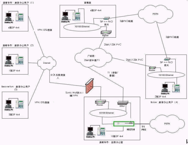系統(tǒng)的安裝是由蘇迪思科技公司的認(rèn)證增值分銷商Xiologix 來(lái)實(shí)現(xiàn)的。在45分鐘內(nèi)Xiologix 的工程師就設(shè)定和調(diào)試完畢MX250并且完成了第一期20部蘇迪思ZIP4x4 IP電話的安裝。一個(gè)月后Consani Associates公司又進(jìn)行了系統(tǒng)擴(kuò)展追加了30個(gè)用戶許可和另外30部ZIP4x4 IP電話。Consani Associates 公司采用蘇迪思科技的MX250系統(tǒng)后的公司系統(tǒng)網(wǎng)絡(luò)拓樸圖如下: