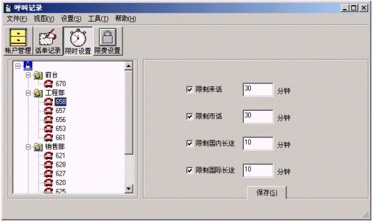 當(dāng)前,商路通實(shí)時計(jì)費(fèi)系統(tǒng)可以根據(jù)每一個分機(jī)、話務(wù)類型進(jìn)行實(shí)時控制?梢葬槍γ恳环N話務(wù)類型(來話、市話、國內(nèi)長途、國際長途)設(shè)置不同的通話時長限制,時間一到立刻拆掉。