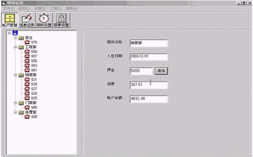·團(tuán)體限費(fèi)功能:多個分機(jī)組成一個團(tuán)體,針對團(tuán)體內(nèi)的每一個分機(jī)根據(jù)呼叫類型限制通話費(fèi)用,可以實(shí)現(xiàn)團(tuán)體的押金管理;