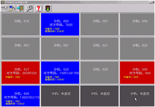 呼叫實(shí)時監(jiān)控功能實(shí)現(xiàn)了實(shí)時顯示每一個分機(jī)摘機(jī)、呼叫、通話掛機(jī)的狀態(tài),以便管理者實(shí)時、動態(tài)了解當(dāng)前內(nèi)部通信網(wǎng)絡(luò)的狀況和每一個分機(jī)或員工的工作狀態(tài)。