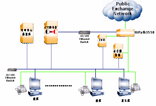 搜易得呼叫中心系統(tǒng)采用SIEMENS HiPath3000通信平臺(tái),融合了商路通公司(www.SynRoute.com)的CTI中間件,為呼叫中心系統(tǒng)的應(yīng)用開(kāi)發(fā)提供了功能完善、系統(tǒng)穩(wěn)定、可靠性高、擴(kuò)展性強(qiáng)等特點(diǎn)的呼叫中心開(kāi)發(fā)平臺(tái)。根據(jù)客戶(hù)業(yè)務(wù)需求實(shí)現(xiàn)呼叫中心系統(tǒng)主要功能:自動(dòng)語(yǔ)音應(yīng)答、ACD分配、統(tǒng)計(jì)報(bào)表、監(jiān)控、錄音等;其中呼叫中心平臺(tái)中的業(yè)務(wù)系統(tǒng)還包含了客戶(hù)資料管理、產(chǎn)品資料管理、售后服務(wù)管理、售前支持管理、問(wèn)卷調(diào)查管理、訂單監(jiān)督管理。整套系統(tǒng)很好地滿(mǎn)足了該中心的業(yè)務(wù)需求。