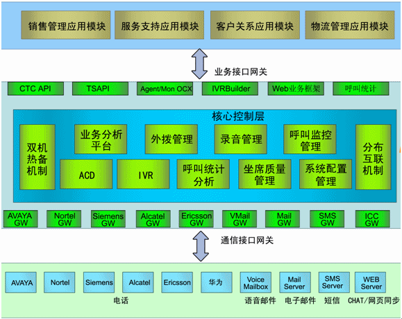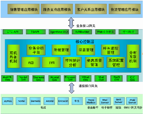 核心控制層:ACD、IVR、呼叫統(tǒng)計分析、坐席質量管理、系統(tǒng)配置管理、業(yè)務分析平臺、預測外撥管理、工作流平臺、坐席資源管理、分布互連機制、雙機熱備機制;