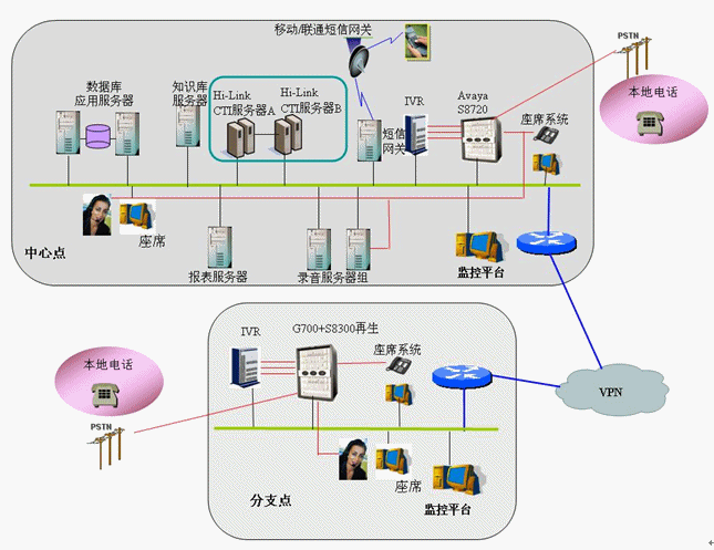 整個網路可以劃分為Internet接入部分、電話接入部分、CTI系統(tǒng)內網、辦公網絡和座席系統(tǒng)5個部分。Internet接入部分實現網絡訪問的受理和轉發(fā);電話接入部分完成電話語音和傳真的接續(xù)和處理;CTI系統(tǒng)內網完成電話呼叫的控制和應用的集成;座席系統(tǒng)部分完成語音和控制信息的接收和處理,為座席提供通話能力和業(yè)務處理能力。