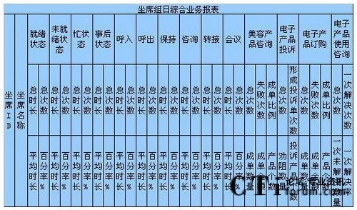 c)如果想對(duì)這個(gè)組的坐席進(jìn)行整體的坐席狀態(tài)進(jìn)行考核,以便確定工作負(fù)荷、績(jī)效考核,形成每天、每月、每季度、每年、按組、按技能,平均、總計(jì)、總合、最大、最小數(shù)據(jù)比較的表格、圖表,對(duì)不起要么你放棄這個(gè)想法,要么你重新開(kāi)發(fā)軟件進(jìn)行計(jì)算;