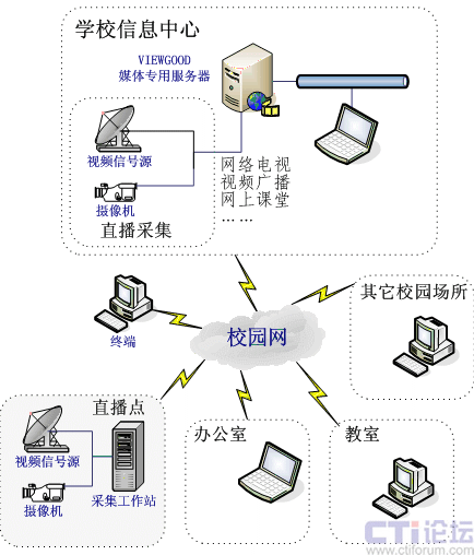 流媒體技術(shù)在教育行業(yè)中的應(yīng)用非常廣泛,從大型的教育城域網(wǎng),到高校再到中小學(xué)。這里我們重點(diǎn)闡述流媒體技術(shù)在中小學(xué)的應(yīng)用,主要包括以下幾個(gè)方面: