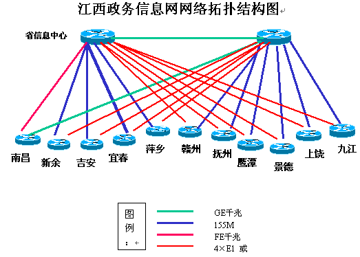 江西省于2002年8月開始實(shí)施省政務(wù)信息網(wǎng)縱向網(wǎng)省市聯(lián)網(wǎng)工程,于2002年12月底實(shí)施完畢。目前,在南昌地區(qū)已建成省級(jí)政務(wù)核心網(wǎng)及政務(wù)專網(wǎng),省委、省政府、省人大、省政協(xié)及一百多個(gè)省直部門,已通過光纜實(shí)現(xiàn)了橫向網(wǎng)絡(luò)互聯(lián)。
