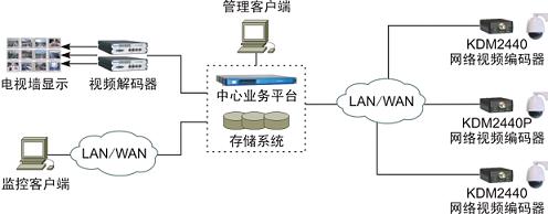 KDM2440/2440P可作為網(wǎng)絡(luò)視頻監(jiān)控系統(tǒng)的智能化前端接入單元,與攝像機(jī)一起實(shí)現(xiàn)監(jiān)控點(diǎn)的集成化部署,攝像機(jī)采集的模擬視頻信號經(jīng)編碼處理后以IP碼流形式上傳至中心業(yè)務(wù)平臺(tái),在監(jiān)控客戶端的管理和控制下,中心業(yè)務(wù)平臺(tái)將上傳的碼流按需轉(zhuǎn)發(fā)到監(jiān)控客戶端、視頻解碼器以及網(wǎng)絡(luò)錄像單元,分別實(shí)現(xiàn)PC瀏覽、電視墻顯示以及錄像存儲(chǔ)。
