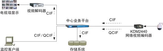 KDM2440/2440P集成了雙碼流功能,可對單路模擬視頻進(jìn)行CIF和QCIF兩種格式的同時(shí)編碼上傳,并由中心業(yè)務(wù)平臺(tái)進(jìn)行差異化轉(zhuǎn)發(fā)。比如,視頻解碼器和錄像存儲(chǔ)單元接收CIF視頻,可實(shí)現(xiàn)較高清晰度的圖像顯示和存儲(chǔ),而客戶端接收QCIF視頻,可有效降低PC資源的消耗,從而保證客戶端在進(jìn)行多畫面視頻實(shí)時(shí)瀏覽時(shí)的應(yīng)用效果。