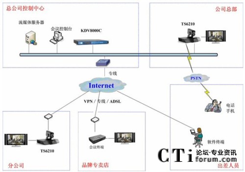 科達(dá)TrueSens視頻會議系統(tǒng)最大的特點(diǎn)就是擁有超強(qiáng)的網(wǎng)絡(luò)適應(yīng)性。由于采用了高效視音頻編碼技術(shù)和大量智能化網(wǎng)絡(luò)適應(yīng)技術(shù),無論是ADSL、光纖還是VPN,均可進(jìn)行快速接入,并充分保證在Internet環(huán)境下的會議效果。勁霸此次視頻會議系統(tǒng)就是基于Internet進(jìn)行部署的。如圖1。
