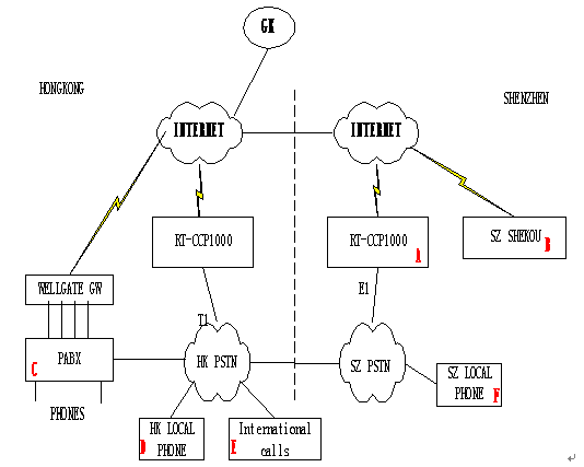 - A點(diǎn)是深圳福田的office,B點(diǎn)是深圳蛇口的辦事處,C點(diǎn)是香港總部的office,D點(diǎn)香港本地電話用戶,E點(diǎn)來(lái)自國(guó)際的呼叫,F(xiàn)點(diǎn)是深圳本地的電話用戶。