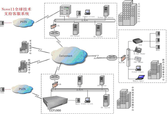 Novell中國技術(shù)支持中心采用融天科技的RT-CCP1000作為呼叫處理平臺,業(yè)務(wù)處理通過Internet用瀏覽器的方式使用美國現(xiàn)有的Siebel CRM業(yè)務(wù)系統(tǒng),作為Novell全球客戶服務(wù)支撐體系的一個分支,響應(yīng)來自全球的客戶服務(wù);贗P網(wǎng)絡(luò),系統(tǒng)設(shè)立了遠端座席,為不同地區(qū)的用戶提供本地化、無差異化的服務(wù)。