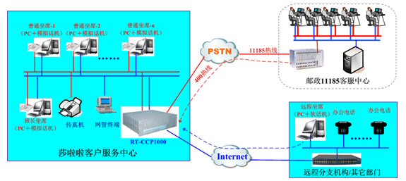 在本次項(xiàng)目中,莎啦啦計(jì)劃前期部署一個(gè)E1中繼,20路人工坐席,并且提供全國(guó)統(tǒng)一的400-710-6600服務(wù)熱線,融天的RT-CCP1000平臺(tái)再次以一體化和IP接入兩大特點(diǎn)獲得用戶(hù)的最終認(rèn)可,系統(tǒng)網(wǎng)絡(luò)圖大致如下: