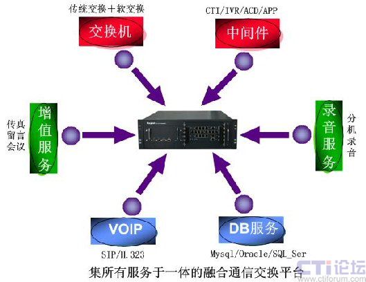 融天科技多媒體呼叫中心采用國際領(lǐng)先技術(shù)的融合通信一體化平臺(tái),該平臺(tái)集傳統(tǒng)PBX、IP-PBX于一體,集CTI、IVR、ACD、APP等服務(wù)功能于一體,集錄音、傳真、會(huì)議、留言等全套的增值業(yè)務(wù)于一體,硬件平臺(tái)非常簡(jiǎn)單,用戶只需要購買一臺(tái)硬件設(shè)備即可: