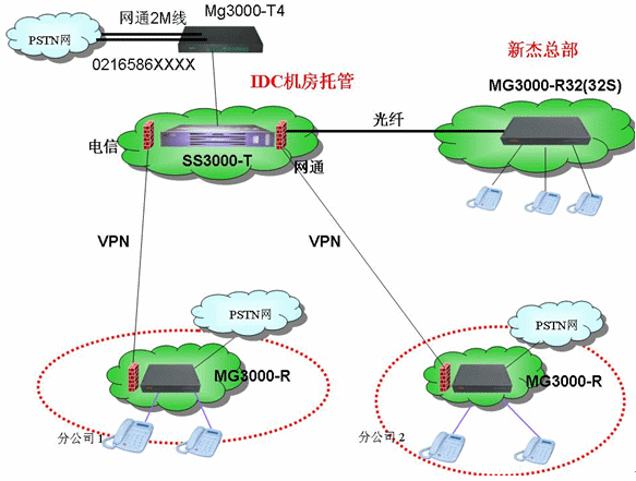 - 各地全部采用MG3000-R,通過VPN注冊(cè)到軟交換平臺(tái)上,S口接普通電話,O口接原來的模擬線,整個(gè)系統(tǒng)通過各地-R的O口實(shí)現(xiàn)長(zhǎng)途落地的功能。