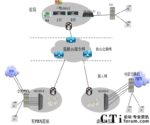根據(jù)河南監(jiān)獄管理局情況大唐高鴻提出在監(jiān)獄系統(tǒng)現(xiàn)有的網(wǎng)絡(luò)建立IP語(yǔ)音系統(tǒng),使各地監(jiān)獄之間的語(yǔ)音服務(wù)運(yùn)營(yíng)在現(xiàn)有完善的IP網(wǎng)絡(luò)上,實(shí)現(xiàn)“語(yǔ)音、數(shù)據(jù)、視頻三網(wǎng)合一”的先進(jìn)網(wǎng)絡(luò)。