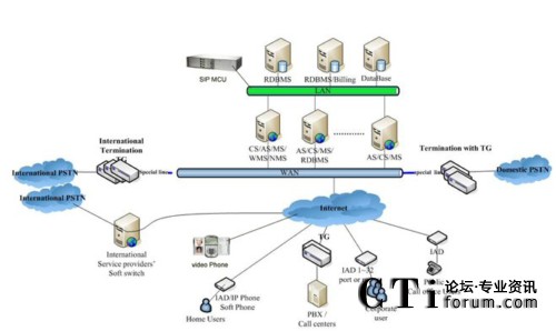 計(jì)費(fèi)系統(tǒng)將把視頻通話和普通的語(yǔ)音通話分開(kāi)來(lái)計(jì)費(fèi),視頻會(huì)議業(yè)務(wù)也可以作為一項(xiàng)特殊業(yè)務(wù)單獨(dú)計(jì)費(fèi)。所有這些業(yè)務(wù)都使用相同的計(jì)費(fèi)和OAM系統(tǒng)。在這個(gè)運(yùn)營(yíng)商級(jí)軟交換系統(tǒng)中,已經(jīng)把視頻業(yè)務(wù)完全集成進(jìn)了系統(tǒng)。下面是網(wǎng)絡(luò)示意圖: