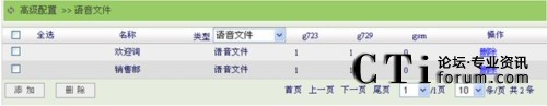 點(diǎn)擊“高級(jí)配置”菜單的“語音文件”子菜單,進(jìn)入語音文件頁(yè)面,在類型選項(xiàng)中可以選擇顯示語音文件或音樂保持文件,語音文件指的是語音菜單、振鈴組等業(yè)務(wù)使用的語音文件;音樂保持文件指的是呼叫保持,三方通話等業(yè)務(wù)用戶聽到的音樂保持文件。如下圖所示: