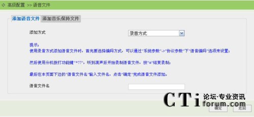 選擇錄音方式添加語音文件時(shí),使用分機(jī)撥打電話錄制語音文件功能鍵“*77”,聽到滴聲后開始錄制,按“#”號(hào)結(jié)束錄制。然后通過“高級(jí)配置”->“語音文件”,點(diǎn)擊“添加”鏈接按鈕進(jìn)入添加語音文件頁(yè)面,選擇添加方式為錄音方式,在語音文件名處為剛剛電話錄制的音文件,添加一個(gè)文件名后,點(diǎn)擊“確定”完成語音文件添加,如下圖所示: