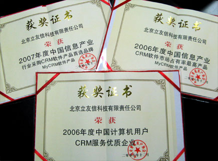 2007年1月16日,中國計(jì)算機(jī)用戶協(xié)會在京召開隆重而盛大的年度頒獎儀式。MyCRM在本次會上榮獲殊榮,一舉囊括了“2006年度中國信息產(chǎn)業(yè)CRM 軟件市場占有率最高產(chǎn)品”,“ 2006年度中國計(jì)算機(jī)用戶CRM服務(wù)優(yōu)質(zhì)企業(yè)”和“2007 年度中國信息產(chǎn)業(yè)行業(yè)采購CRM軟件產(chǎn)品首選品牌”。本次獲獎充分體現(xiàn)了MyCRM在CRM市場的全面領(lǐng)先優(yōu)勢。