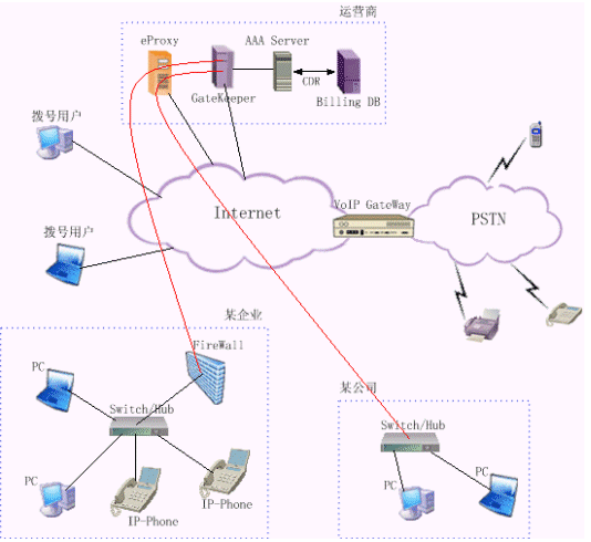 運(yùn)營(yíng)級(jí)IP電話解決方案為運(yùn)營(yíng)商提供一種可靠經(jīng)濟(jì)的VoIP接入平臺(tái)與VoIP骨干網(wǎng)互連,這種方式可以充分利用網(wǎng)絡(luò)資源,降低用戶服務(wù)價(jià)格,提高運(yùn)營(yíng)商的競(jìng)爭(zhēng)力。它為用戶提供了多種業(yè)務(wù)類型,除了可以實(shí)現(xiàn)任意兩點(diǎn)間的PC互通外,還可以實(shí)現(xiàn)PC通過VoIP網(wǎng)關(guān)與PSTN用戶間的互聯(lián)互通。