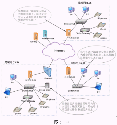 該系統(tǒng)建立在NGN基礎(chǔ)上,包括交換中心Asiasoft Gatekeeper,解決NAT、防火墻的代理軟件eProxy和視頻多點(diǎn)控制單元MCU,這些都建立在ITU制定的標(biāo)準(zhǔn)H.323協(xié)議上。一般單位和企業(yè)為便于管理和應(yīng)用,都建設(shè)了使用私有IP 地址的局域網(wǎng)(LAN),當(dāng)需要訪問(wèn)外網(wǎng)時(shí)必須進(jìn)行地址轉(zhuǎn)換(NAT)。局域網(wǎng)內(nèi)的終端之間進(jìn)行呼叫和通信時(shí)沒(méi)有任何問(wèn)題,但與外網(wǎng)終端進(jìn)行VoIP通信時(shí)就會(huì)有問(wèn)題產(chǎn)生,原因是局域網(wǎng)中的IP地址是私有的,在Internet中不可路由。為了解決VoIP通信協(xié)議不能穿越防火墻和NAT的問(wèn)題,亞軟軟件技術(shù)股份有限公司推出了eProxy代理軟件。它可以在確保網(wǎng)絡(luò)安全、不改變已有設(shè)備和網(wǎng)絡(luò)環(huán)境的情況下,為用戶(hù)實(shí)現(xiàn)實(shí)時(shí)的點(diǎn)對(duì)點(diǎn)IP語(yǔ)音、視頻和數(shù)據(jù)通信服務(wù)。(如圖1所示)
